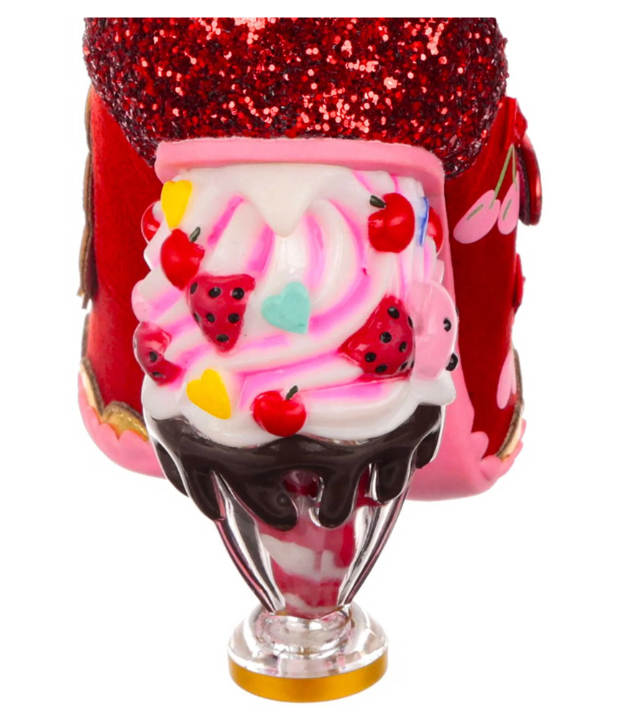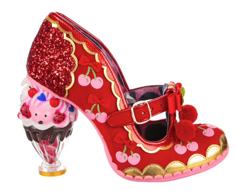 Would you like a flake with that? Berry red t-bar high heels are sprinkled with juicy cherries and matched with a perfect ice cream sundae concept heel. Buckle into these scrumptious red, pink and gold shoes and your heart will melt with happiness! Get a taste today!