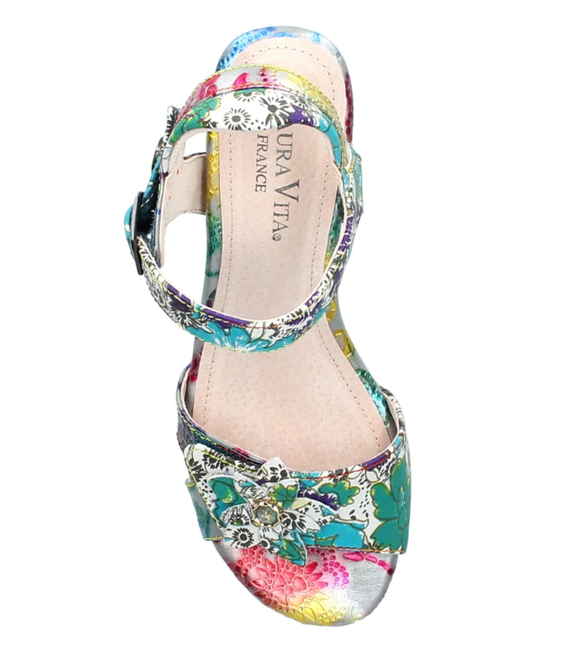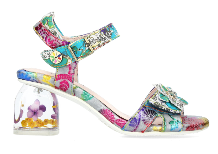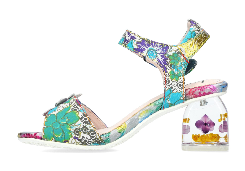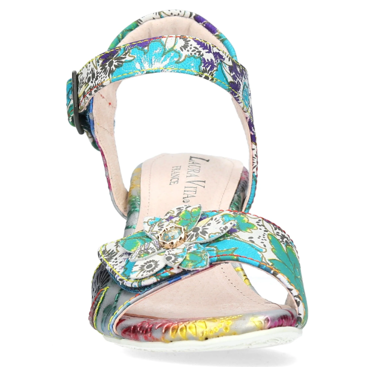 The Laura Vita Framboiseo Indigo sandal brings playful French design to your wardrobe. Adjustable velcro straps over the toe and ankle ensure a perfect, comfortable fit. Its standout feature is the stunning resin heel filled with vibrant flowers, adding a unique and cheerful touch to every step. Embrace fun and flair with these delightful sandals!