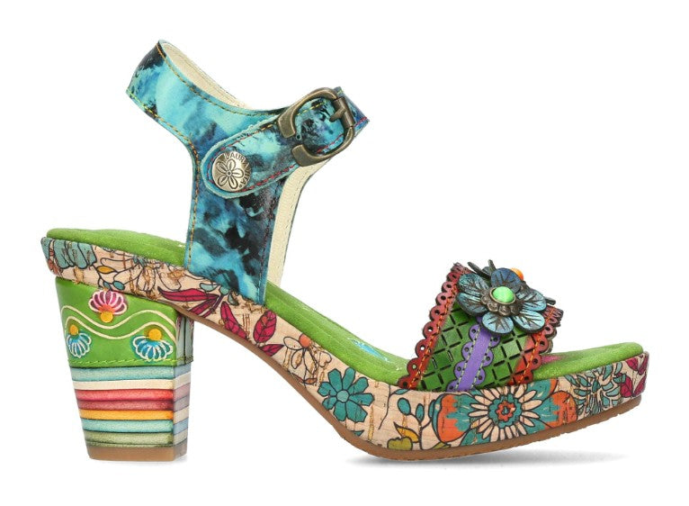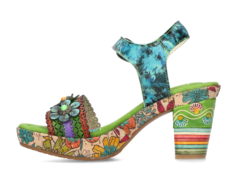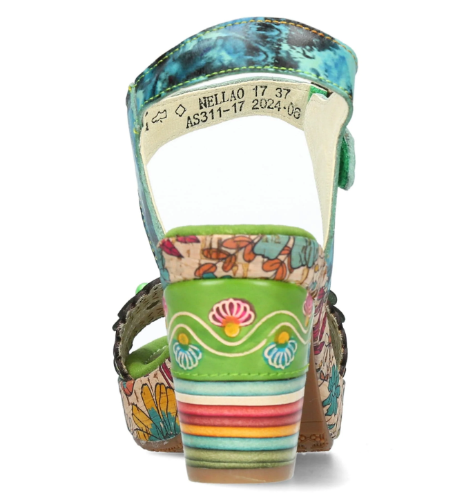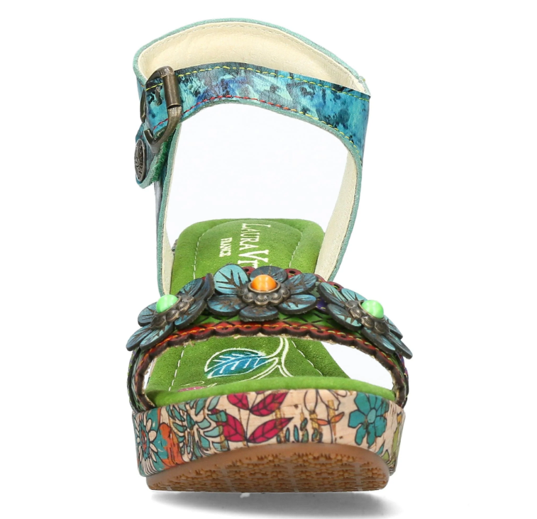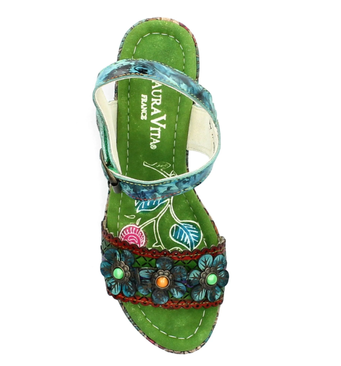 Add a splash of French flair to your summer look with these delightful Laura Vita Nellao Vert platform sandals. Featuring fun flower details over the toe, with a bright pop of color, they bring playful charm to every step. The adjustable Velcro ankle strap ensures a perfect fit, combining comfort with style for all your sunny adventures.