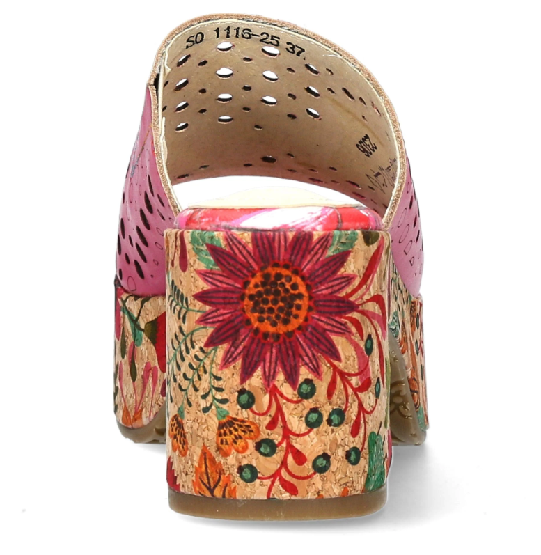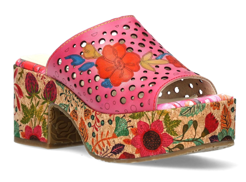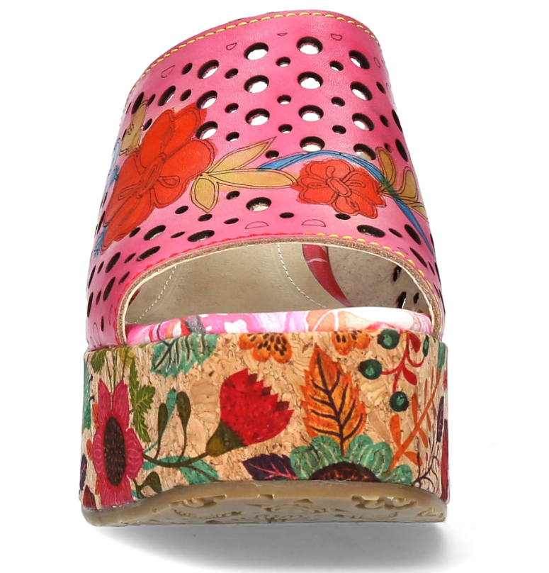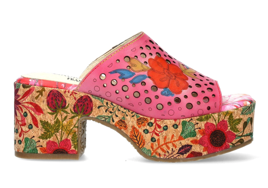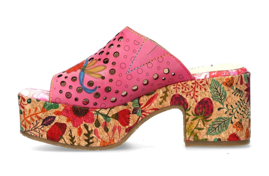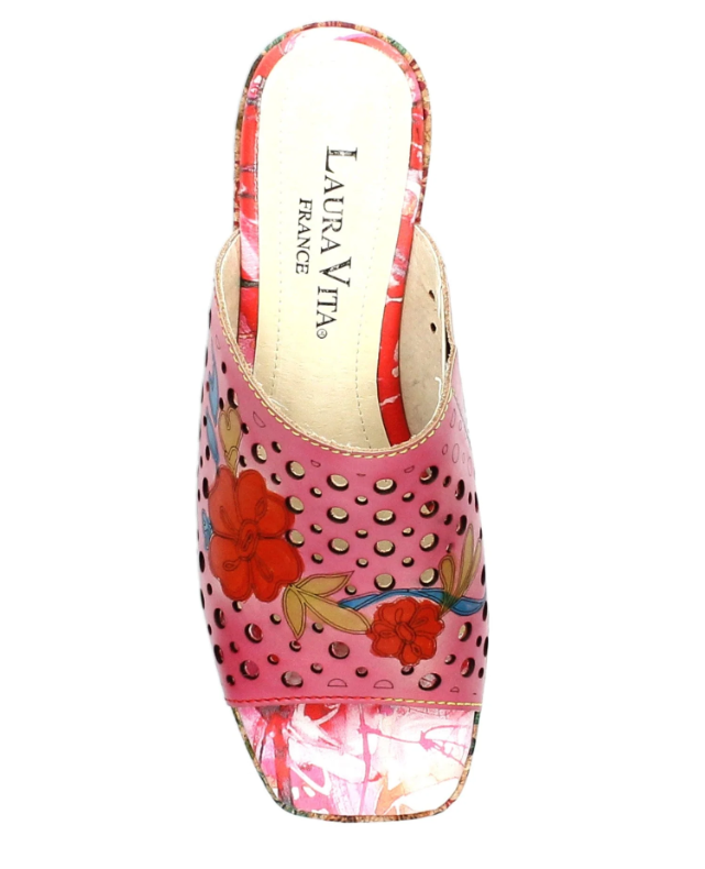 Add a little playfulness to your step with the Laura Vita Paulao Fushia mule platform style shoes. Slip them on easily and be sure to make a statement with the bold and bright pink color. The floral detail printed on the platform adds a fun touch to the French design.