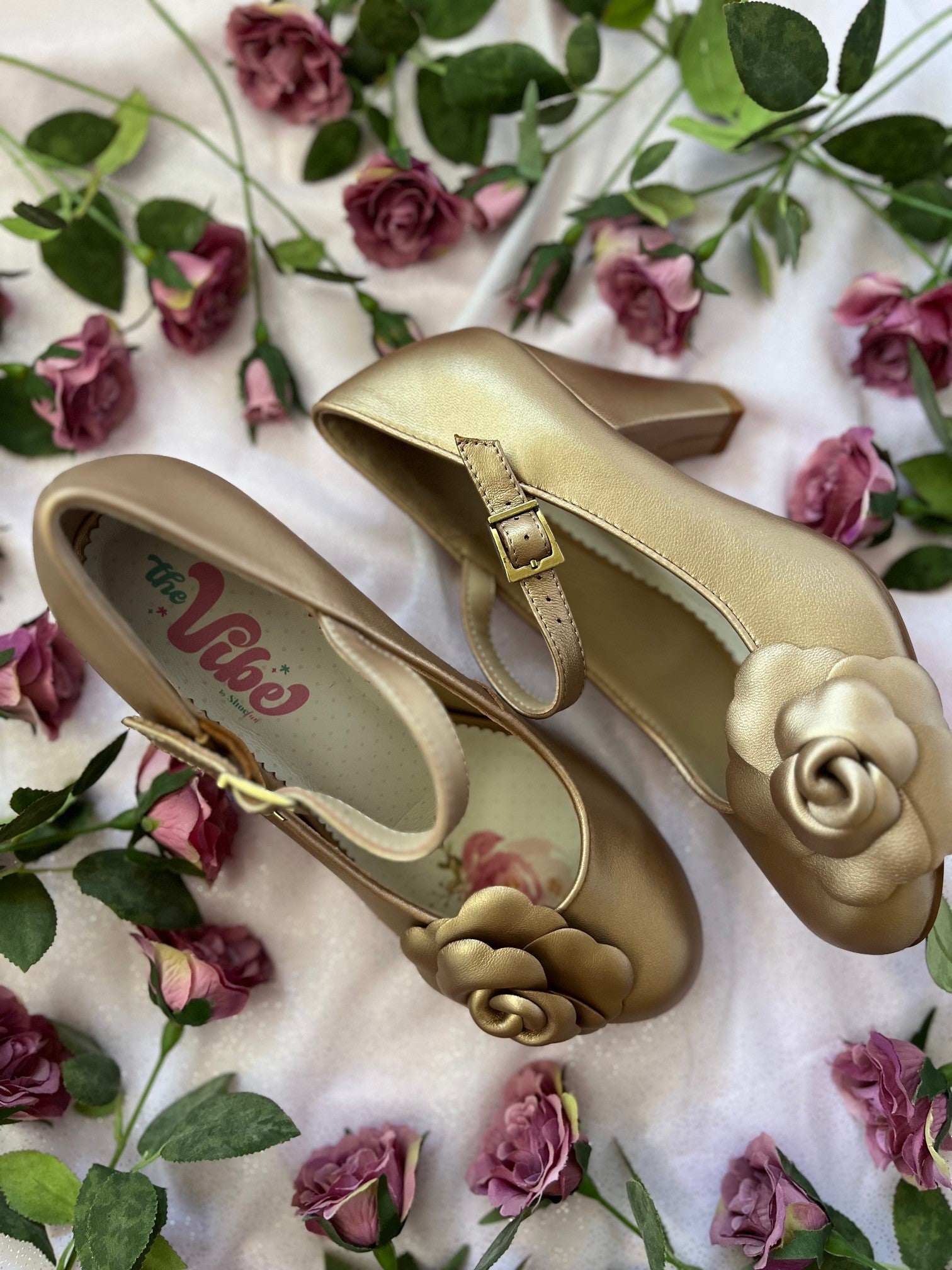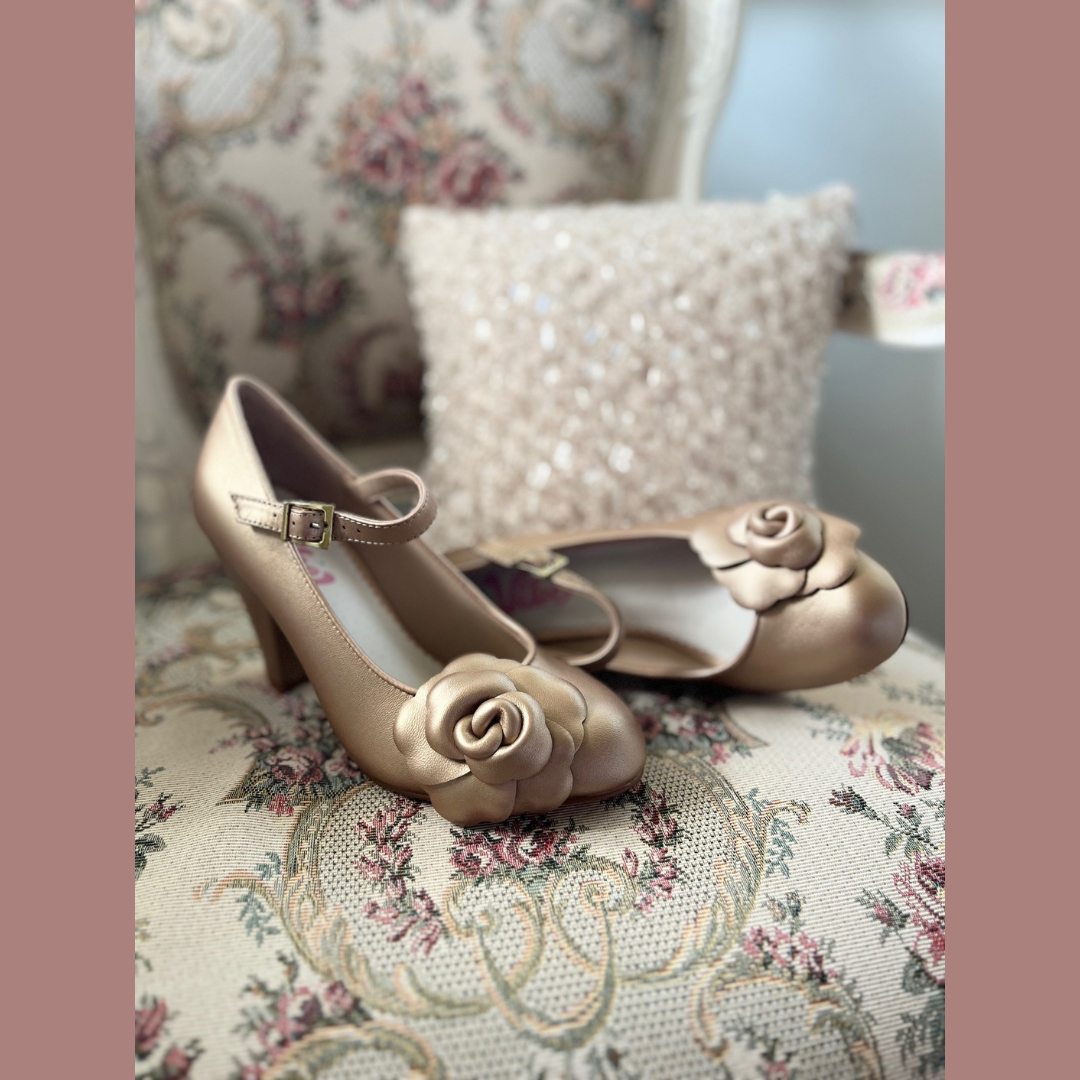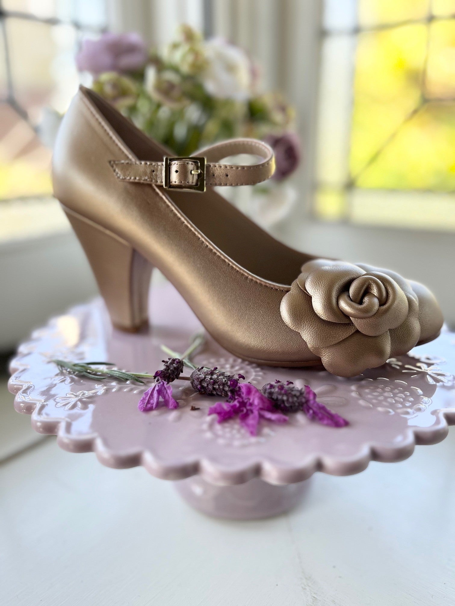 Indulge in the perfect blend of retro style and modern elegance with The Vibe is Elegance in Rose Gold. Adorned with a delicate flower detail over the toe, this dainty rose gold metallic leather heel features an adjustable ankle strap for a secure fit. Whether dressing up or down, this sophisticated shoe adds a touch of luxury to any outfit.