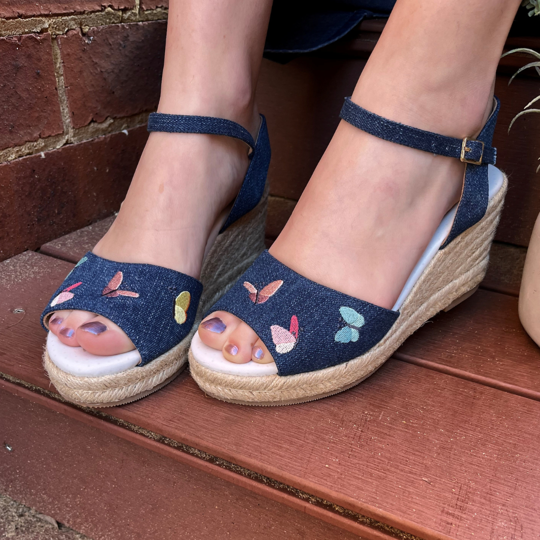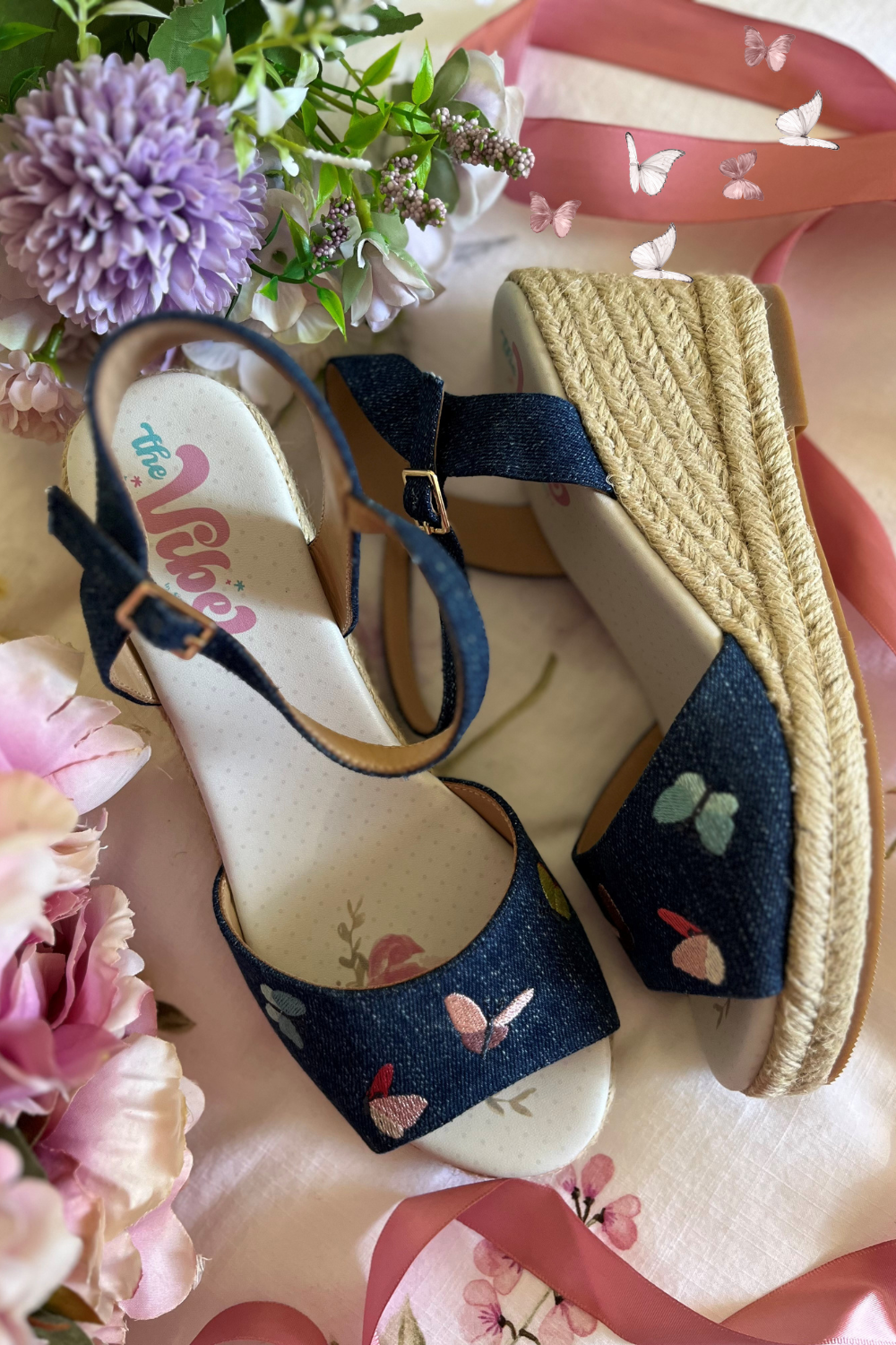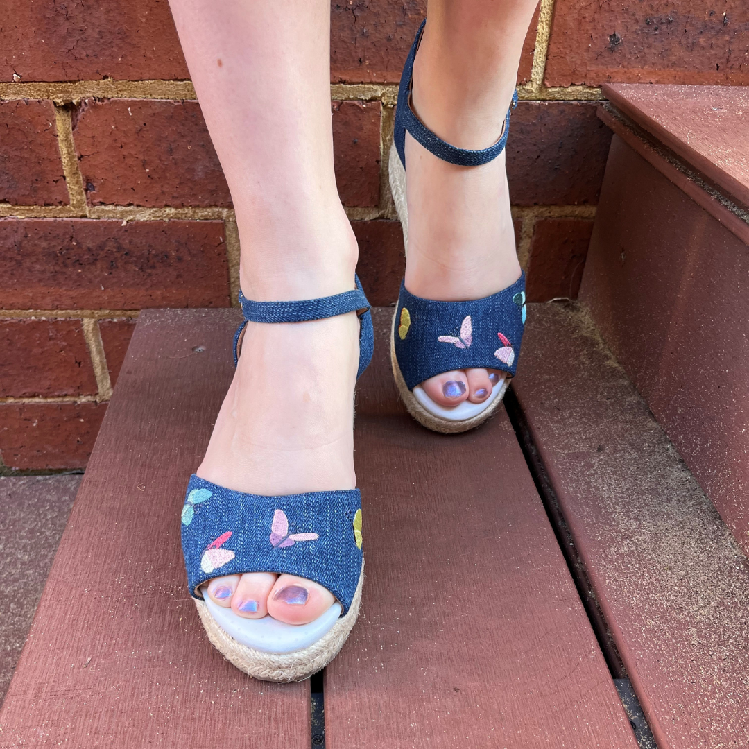 Step into sunshine with The Vibe is Flutter Denim espadrilles. Featuring charming embroidered butterflies in multi coloured hues on versatile blue denim, these shoes bring playful flair to any outfit. Adjustable straps ensure a perfect fit, making them super cute and comfy whether you’re dressing up or keeping it casual.